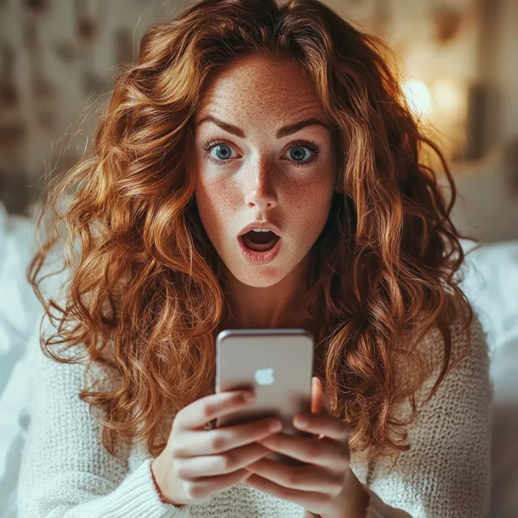 A shocked woman holding a phone | Source: Midjourney