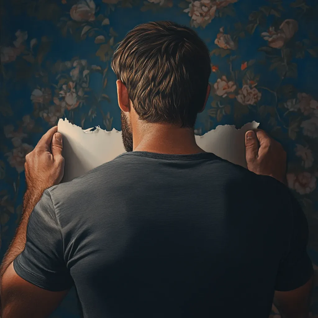A man turning around while removing a wallpaper | Source: Midjourney