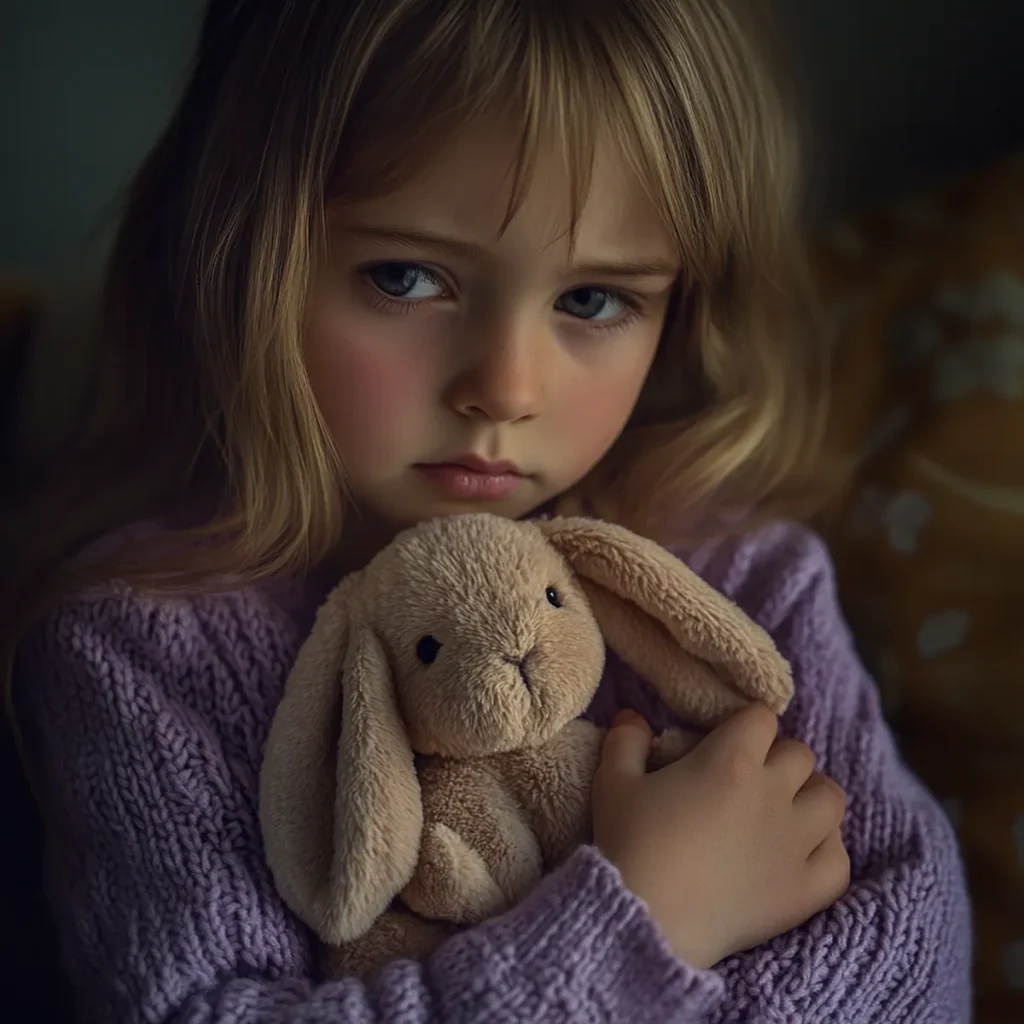 A sad little girl holding a stuffed rabbit | Source: Midjourney