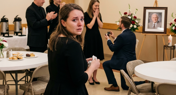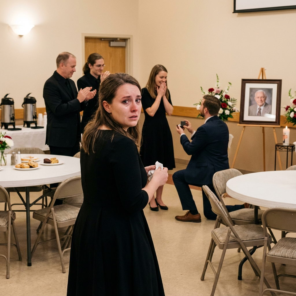 Jason was on one knee in the corner of the reception hall, right in front of the big floral arrangement that had been next to Mark’s casket during the service. Brittany had her hands over her mouth, doing the fake-surprised thing, mascara perfectly intact. People had formed a loose semi-circle around them. Someone was filming on their phone.